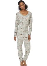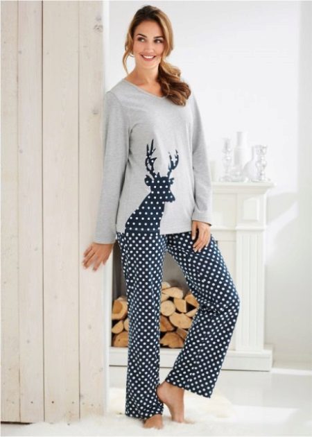 Fleece pajamas with a deer look original and stylish. The set includes long pants with polka dots and a plain jacket of a tight-fitting cut with appliqué on the side to match the bottom.