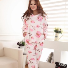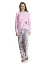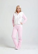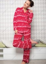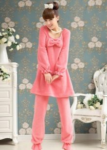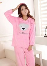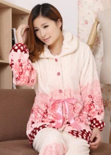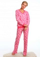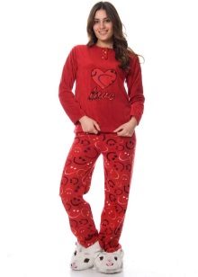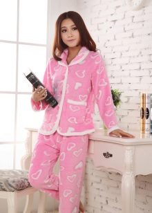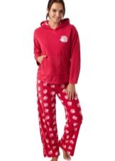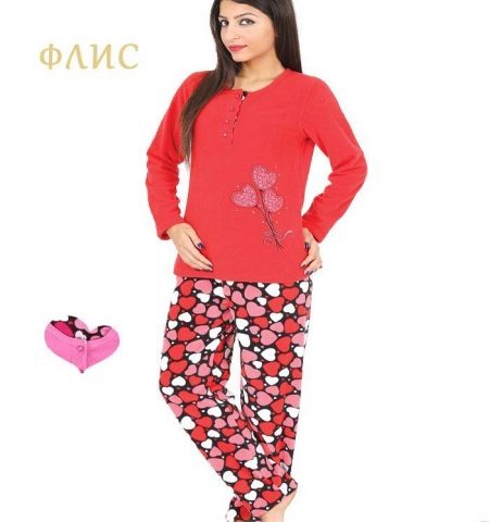 For the embodiment of a delicate, romantic bow, an ideal option is coral-colored fleece pajamas decorated with hearts. A button-down sweatshirt is plain and decorated with a small applique. Long pants are decorated with hearts of pink, red and white, which create an unforgettable impression and cheer up.