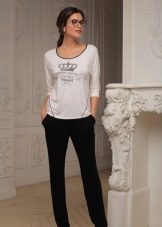 Blouse + pants.A blouse can have a short or long sleeve, made in the form of a T-shirt, T-shirt, shirt, longsleeve. To be direct or fitted.