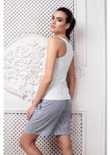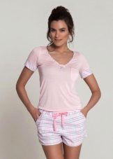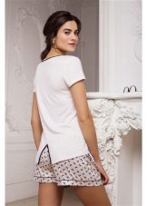 - Top + shorts. A lightweight version of pajamas for the warm season. It is made of viscose, micromodal, elastane, satin. For design, inserts from lace or guipure, braid, lurex are used. The top can have shoulder straps adjustable in length, and shorts can be decorated with decorative cuts on the sides.