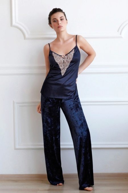 An elegant set of the finest material in deep blue consists of a top and trousers. The top on thin straps with a deep V-neck is decorated with elegant lace in contrasting color.