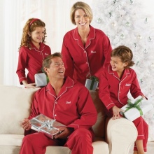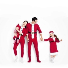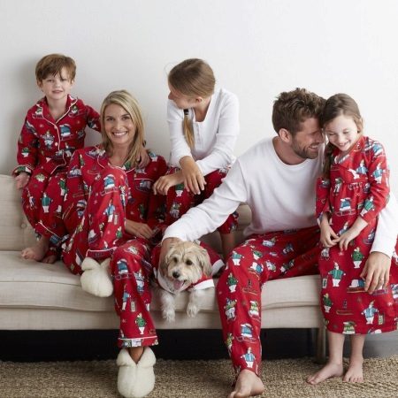 Bright Christmas pajamas already set up for a festive mood. Moreover, not a single suit is repeated. All five sets are made in an individual style (a red pajamas dress, a light white shirt and bright red pants, a completely red suit with a white edging), but have one common line - red color and a whole New Year theme print.