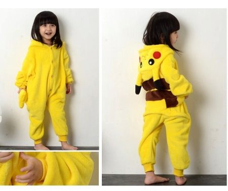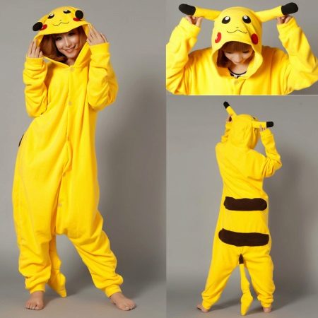 The main feature of pajamas with the image of Pikachu is the similarity with this Pokemon. It is mandatory to use yellow and black, although there are options where the yellow was replaced with pink (the image of the Pikachu girl), but the Pokémon did not lose recognition.