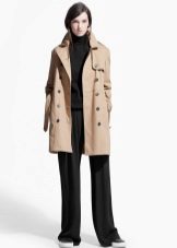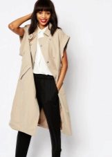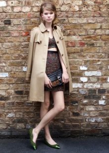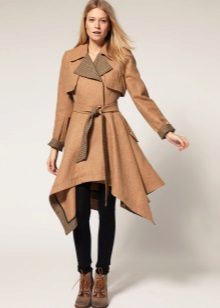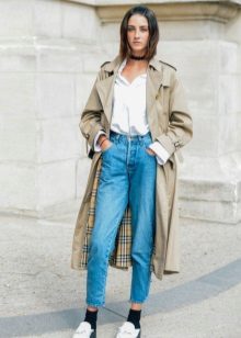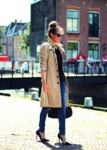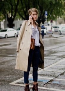 - Probably every fashionista has a classic beige cloak. It looks simple, without any frills: knee-length, straight fit, turn-down collar, buttons or zipper, strap at the waist. This cloak is combined with jeans and strict skirts. It is worn both for work and for walks.