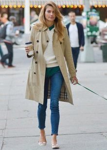 To create a stylish casual look, wear a Burberry-style cloak with skinny or straight blue jeans, comfortable but beautiful shoes, and a low-key top.