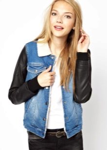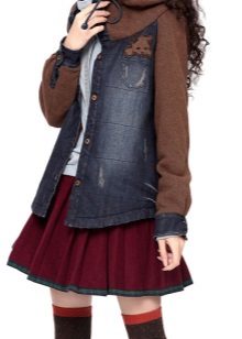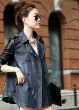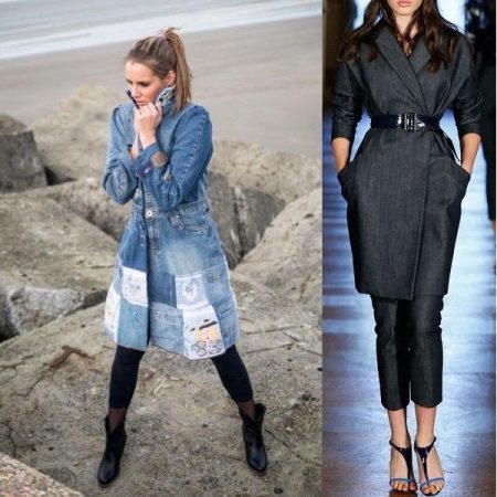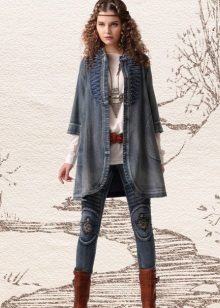 A denim cloak goes well with genuine leather items. The combination of a light top with pants or a leather skirt and exquisite pumps looks great.