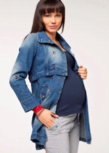 A denim cloak will become a real find for a pregnant girl. Thanks to a special cut, it allows you to feel comfortable at any stage of pregnancy. Among the variety of models, high-waisted models on the yoke both in front and behind, trapezoidal options, and raincoats with a straight cut on buttons or zippers are in great demand.