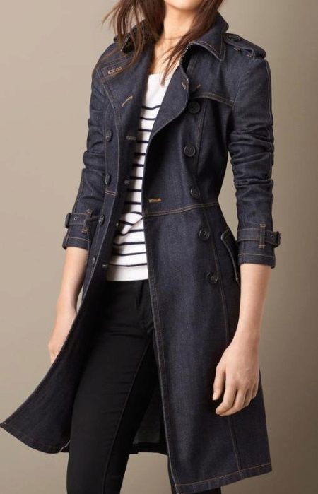 For a casual look, a denim coat over a black and white striped sweater and black pants will be the perfect combination. A shortened sleeve, large buttons and a beautiful collar will give the image of charm, femininity and brightness.