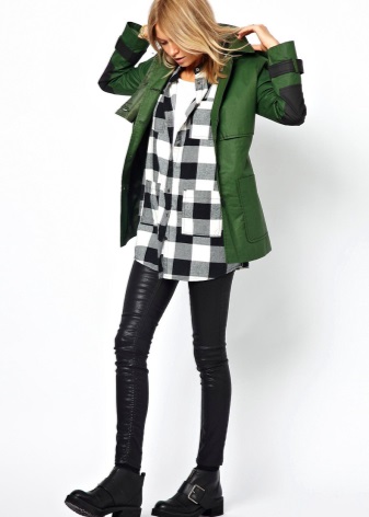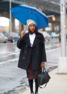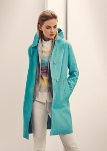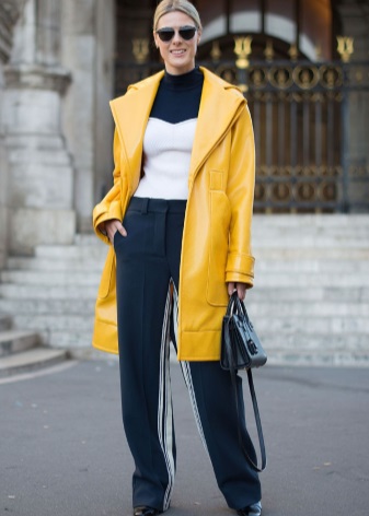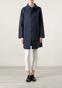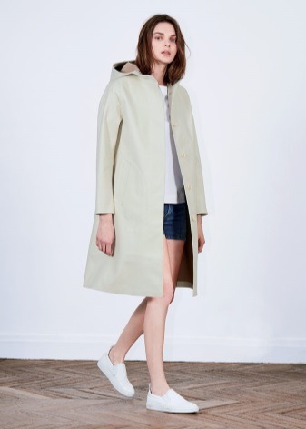 A black trench coat is best combined with light trousers made of light fabric. The white mac looks with dresses in linen style or overalls. Bright shoes and a bag perfectly complement the completely light images. Some fashionistas do not hesitate and throw a cloak on a black jacket, but such images will only fit slim and tall girls.