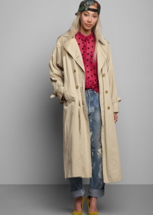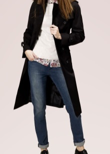 The raincoat-mac perfectly matches jeans. Moreover, you can wear it with both classic and boyfriends. But for the latter, it is better to choose high-heeled shoes. Good look - boyfriends + top + classic boats. For a sporty style, regular jeans with a shirt and sneakers are suitable.