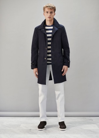 A strict shirt that will “peek out” from under the sweater along with jeans and boots will also fit perfectly into the business image. For a freer look, a casual shirt with dark or wool trousers and classic shoes will do. A dark mac will perfectly complement light trousers, a dark shirt and a tie to match. A navy trenchcoat along with a gray polo will become the foundation of a casual style. Round off this look with light blue trousers and suede boots.