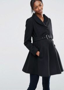 - with a flared hem and a belt at the waist.