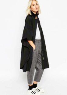 A casual look will be made cozy and comfortable by a cloak combined with pipe pipes. On the legs, stylists recommend ankle boots with flat soles or heels.