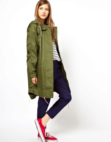 Sports raincoats are suitable for outdoor activities, walking around the city or shopping, so they are combined with trousers and jeans, sports shoes.