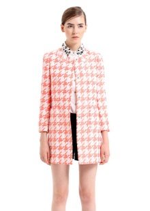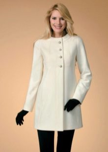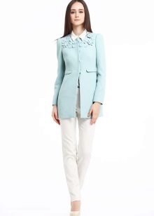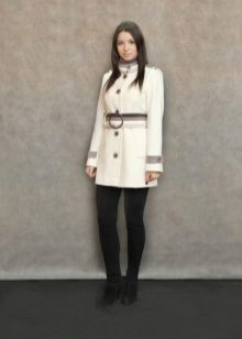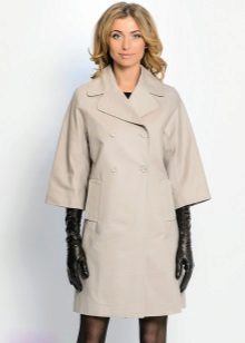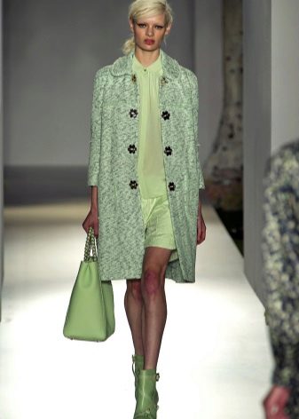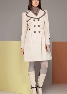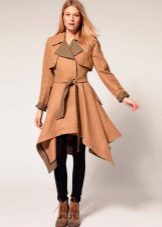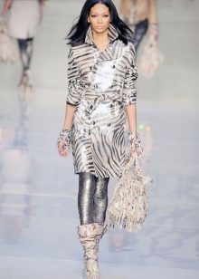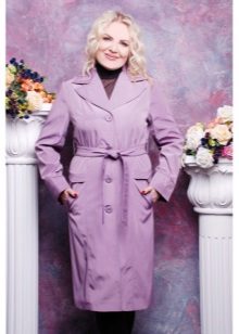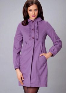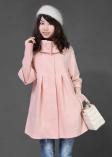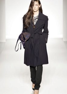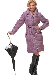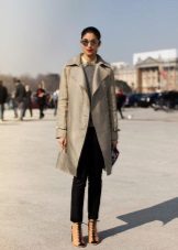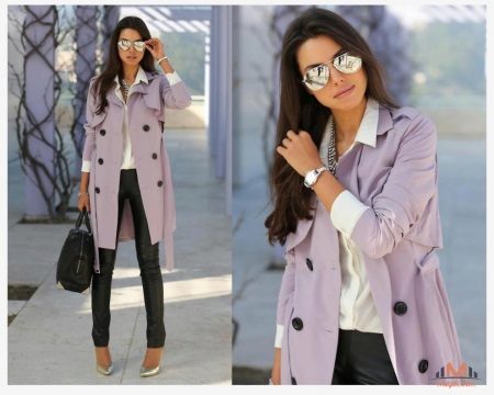 The fitted model of a light lilac cloak will go well with leather leggings and a white shirt. A large black bag fits this kit in the best way possible, and silver heeled boats will become a bright spot.