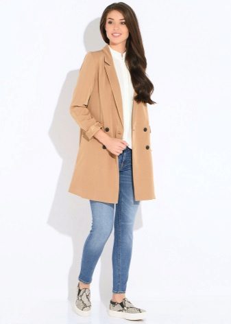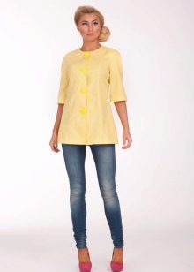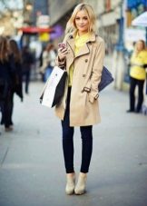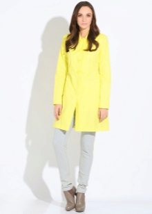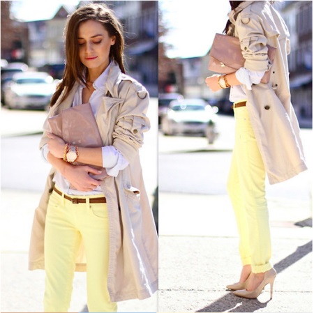 An incredibly delicate look is obtained when choosing straight-cut lemon jeans, a white shirt and an ivory cloak. In addition with beige boats and a clutch in tone, the outfit will look more elegant, and if you bend the sleeves of the cloak, the image will be a little daring.