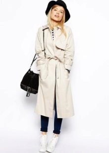 A pretty stylish look is obtained with a classic white shirt, a gray plain sweatshirt and jeans with small holes. A classic cream-colored cloak with a wide belt from the same fabric is perfect for such a set of things. In addition to black boat shoes, ballet flats and a large black bag, the look will be irresistible.
