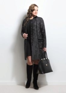 A black A-line cloak will look great with a dark dress, decorated with bright peach-colored spots. Round off this look with black knee high boots and a dark brown tote bag.
