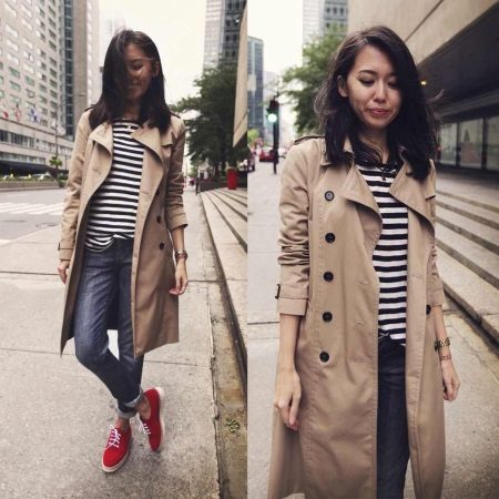 The effective combination of a black and white vest and jeans with lapels will perfectly complement the classic sand cloak model, giving the image a hint of rigor and poise. And red sneakers will become a bright, unusual spot and refresh a more relaxed combination of other things.