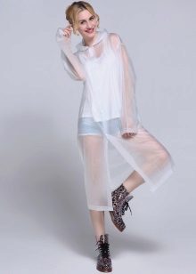 A raincoat made of special synthetic material. Of the pluses - most often cheaper cost than fabric models. It is very convenient to take such a raincoat with you on a trip instead of a heavy umbrella, which, moreover, will occupy your hands and not protect your legs.