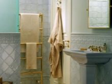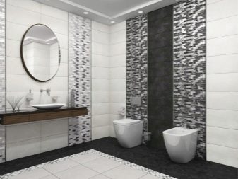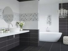 This decor has already become a classic for bathrooms. It implies that the wall is divided into two parts. The upper or lower part may be larger, or both parts are equal. The lower one is decorated with tiles of darker colors, and the upper is decorated in light colors.