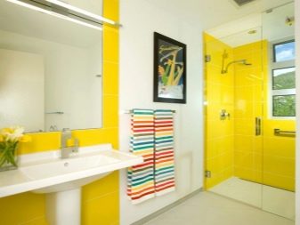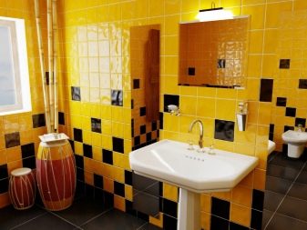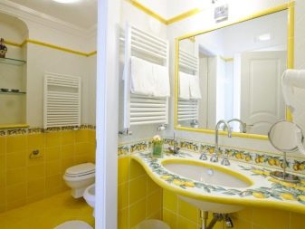 Saturated and positive yellow energizes us. But it is worth considering one feature of such a tile. Yellow color is able to visually reduce the room, although it relates to light colors. It should also be understood that there should not be too much bright yellow. Otherwise, you run the risk of getting not a stylish bathroom, but a large “yellow spot”.