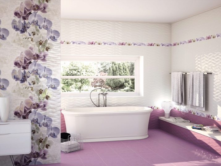 One of the common colors used in the design of the bathroom, which is decorated with tiles with orchids, is white and lilac. It is tenderness that promotes relaxation and rest. Decorate the screen and the lower part of the wall adjacent to the bathtub with plain lilac tiles. The border with an ornament from orchids will be an excellent separator of light and dark shades. The final touch is the image of flowers in the central part of the wall.
