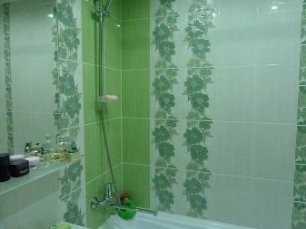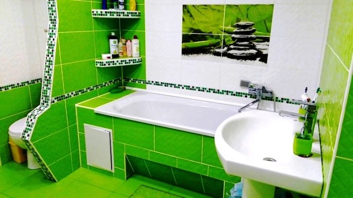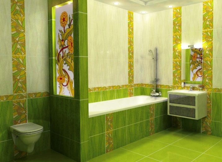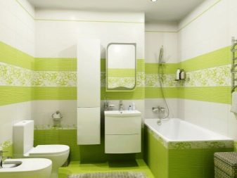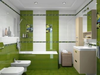 There is such a scheme: a combination of white and green tiles, separated by a small curly barrier. The coloring of this barrier is reproduced in the drawings placed on a white tier. Thanks to this approach, ordinary white plumbing will also look attractive. But sometimes they act differently: use a mosaic of green pieces of various saturation. Together, they immediately attract attention, cause admiration.