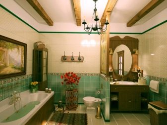 In the Mediterranean style, green tiles are quite appropriate. It can even be used a little more than usual. However, for a more complete disclosure of the style, this material is advised to combine with natural wood. As for the “precious” colors, they are suitable for bathrooms decorated in the spirit of glamor, art deco and modern classics. Instead of the traditional tile, they often use a mosaic layout or a “boar”.