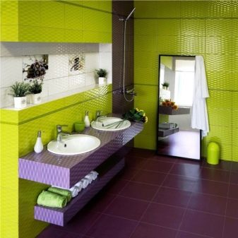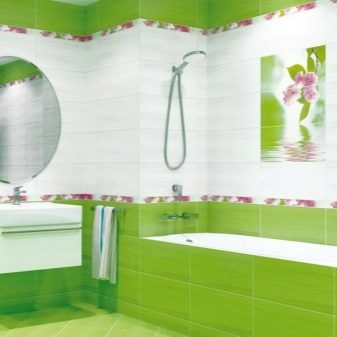 If you use lime-colored tiles, you can create a great room modernist plan. But in the green tones of a natural look, they design a room that should express the concept environmental style. Marine style can be expressed not only in the corresponding dark green color of the tiles. It is quite acceptable to use other variants of this color if a wave-like ornament is made around the perimeter of the blocks.