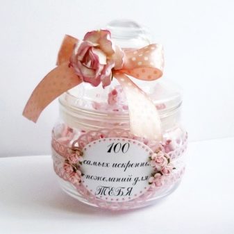 Today, a popular option is considered decorative jar filled with notes. Such a gift can also be easily made with your own hands. On each multi-colored piece of paper, you can write good wishes for the birthday girl. The jar can be decorated with colored paper, cardboard and sparkles.