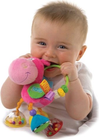 - Little toys. They can be made of plush, fabric, equipped with a variety of details that rustle and peep. They have tiny mirrors, bright details. Such toys can be hung in a stroller, crib, baby mat, so that the baby touches them, fingering them, hitting them with pens.