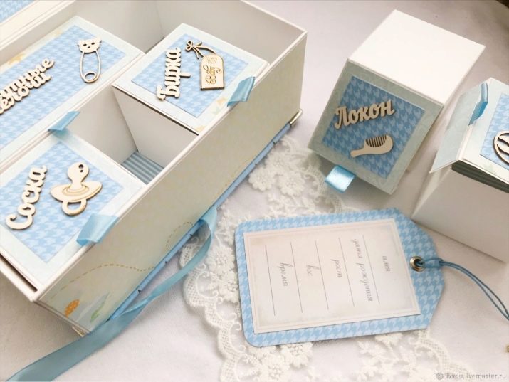 You can make a box for a newborn boy called "Mother's treasures." It will be a beautiful box in which parents will save the first clipped curls, the first tooth that fell out, tags from the hospital, etc. You can design a box-box in a variety of styles, the main thing is to convey the message itself and correspond to the idea that its contents belong to the boy.