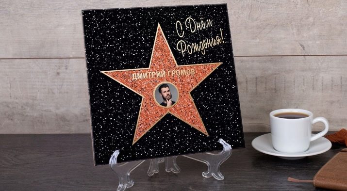- Hollywood star. The original way to congratulate a guy is to give him a star straight from the Walk of Fame - the place where the stars of all Hollywood celebrities are located. A souvenir is a tile, in the center of which is a red star. Just below the center is the engraving of the name and surname of the person to whom the gift is intended. Such a present will be appreciated by the young generation, which is fond of movies and Hollywood actors.