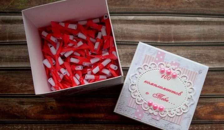 - Box with compliments. Write on small pieces of paper one compliment pertaining to your man, roll them into rolls and put them in a large beautiful box in the shape of a heart. Your half will be pleasantly surprised by the number of warm words on your holiday.
