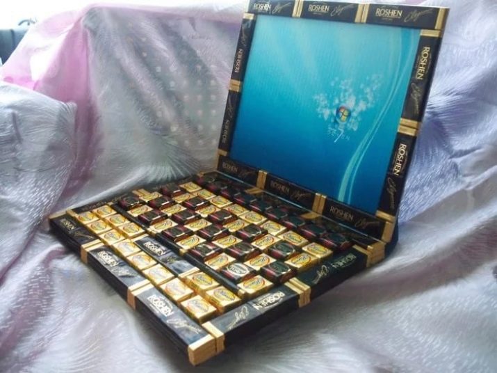 - Laptop made of sweets. If your young man has a sweet tooth, then buy a box of chocolates that he loves and arrange them as a gadget. To do this, glue the lid to the box at a right angle, glue it with candies around the perimeter to make a screen, and put dense rows of candies in the box itself. To make the idea even clearer, print a desktop image or search engine page on a color printer and insert it into the candy border of the screen.