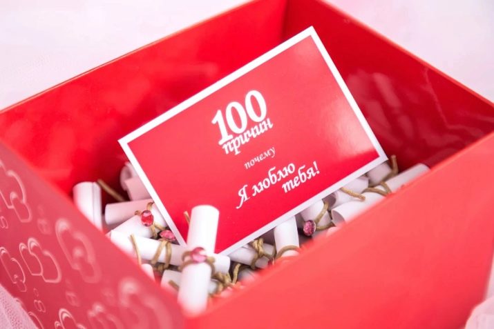 - Box with declarations of love. Cut 100 strips of colored paper, write a compliment on them to the guy and twist with a tube. Fold all the bundles in one box and tie them together with a beautiful ribbon. Sign it somehow romantic, for example, "100 reasons for my love for you."