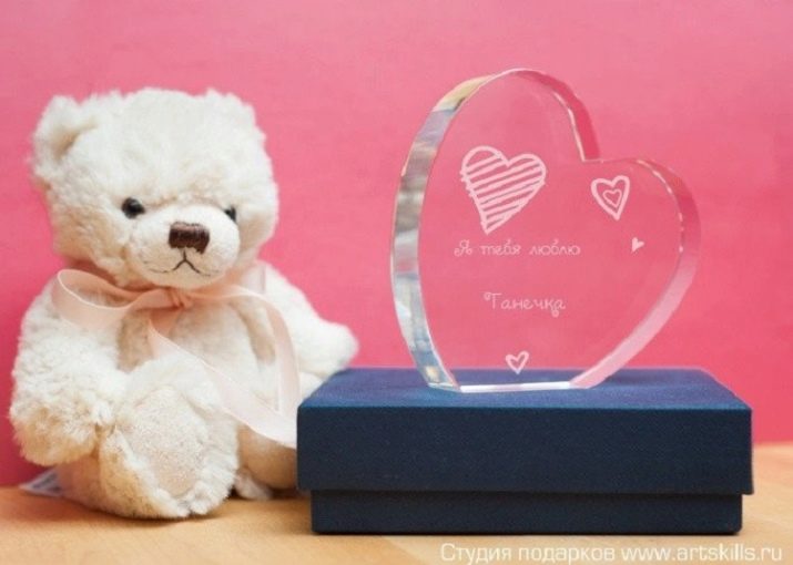 - If a girl likes souvenirs, then she can be presented with an unusual present - a glass award in the form of a heart with laser engraving. Such a non-trivial souvenir award will be a successful romantic surprise.