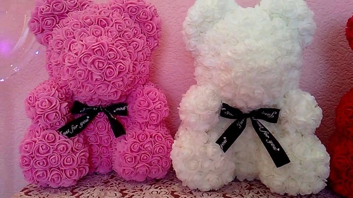 - The latest fashion trend is bears made of flowers. Most often, charming bears of different sizes are made of roses, which are tightly and neatly glued to each other. As a rule, such products are checked for defects, therefore, they usually have a perfect shape without any errors. High-quality flower bears are made with the use of special odorless glue, as well as aromatized with signature perfumes. This is a very interesting and sweet gift for your beloved on February 14th.