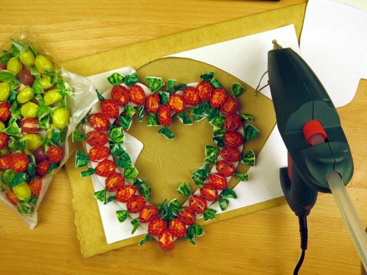 - An interesting present for your beloved is a sweet Valentine. To make it, you must first cut out a big heart from cardboard. After that, on a cardboard base you will need to stick the sweets in a bright red wrapper.To fix sweets, it is recommended to use double-sided tape. Stick the candy carefully. The result is an original delicious present.