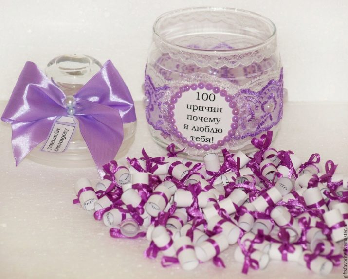 - A good gift would be a jar of "100 reasons why I love you." The outer side of the container can be designed at your discretion, for example, wrapped with gift paper. Inside the jar, you need to put small twisted leaflets with confessions written on them. No need to skimp on gentle words. A full jar can be placed next to the bed, so that in the morning the girl immediately found her and was pleasantly surprised.