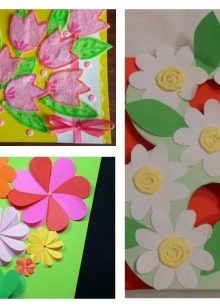 Together with the child, cut the stem, leaves, flower, and core from colored paper. Let the child choose the color of the details. Help the kid stick all the elements correctly and evenly onto the outside of the postcard.