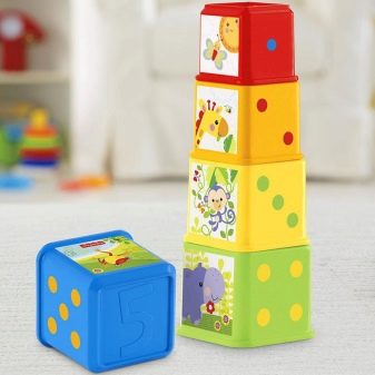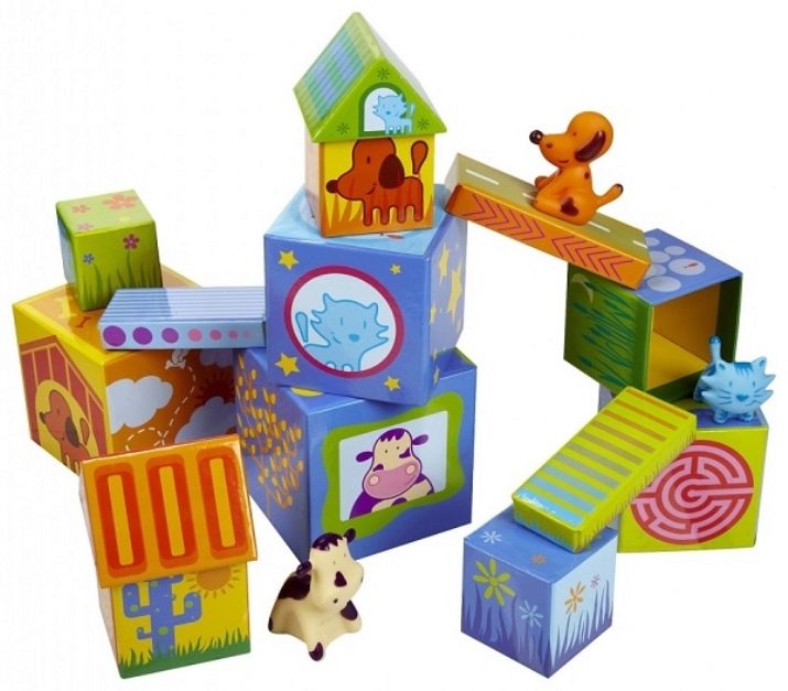 - Set of colorful cubes - A classic of educational games for the year. Cubes can be small and modest or large, from which you can build a whole town; soft and hard, with drawings and without, the child will be equally happy with them, because folding and combining objects with each other is his favorite pastime now. If mom and dad are afraid that the child may be injured on the hard edges of the cube, you can take a set made of fabric, there are such products.