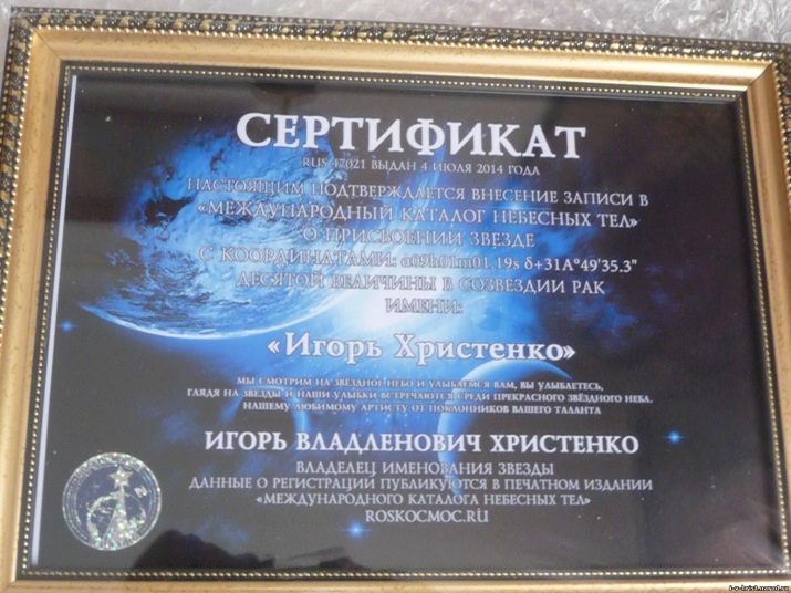- Certificate for a star. Today it is a fairly common gift. As a confirmation of the name assignment to the night luminary, a map of the night sky with the coordinates of the star and relevant documents are provided.