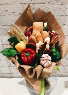 If you do not know how to cook, then you can create a luxurious bouquet yourself. But only it should not be a bouquet of simple flowers. For a woman, you can make a beautiful and tasty bouquet of sweets, and for a man, you can make a bouquet of meat delicacies. But the photo bouquet can become universal for the hero of the day, both female and male.