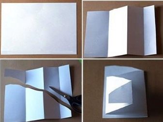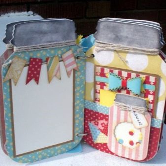 An extremely simple idea to implement is a card in the form of a jar. On half of the sheet you need to draw the outline of the can or print it. In the middle of the can, we cut out a window, and from the inside we glue it with a piece of transparent polyethylene. Next, we fold the sheet in half with the gateway and fix it with glue, as we did with the bags earlier. From below, we simply tuck the paper and seal it.