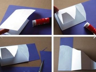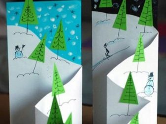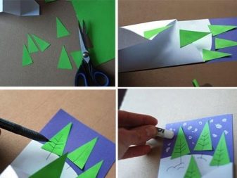 We take a sheet of paper and fold it with an uneven accordion, then cutting the angle along the oblique line. After that, we glue our blank to a strip of blue or blue paper. Next we take green paper and cut out our Christmas trees with simple but varied triangles. We stick them all over the card, not forgetting to fill in the white fragment, do not worry to crawl out of bounds.