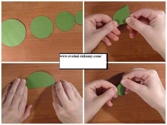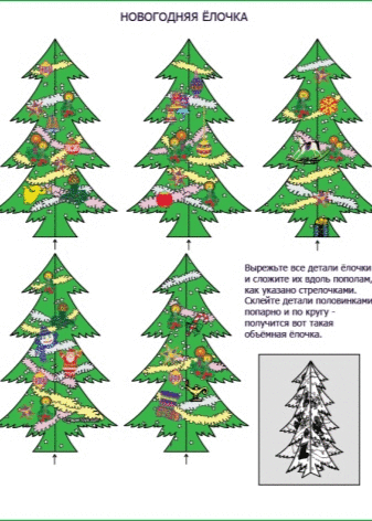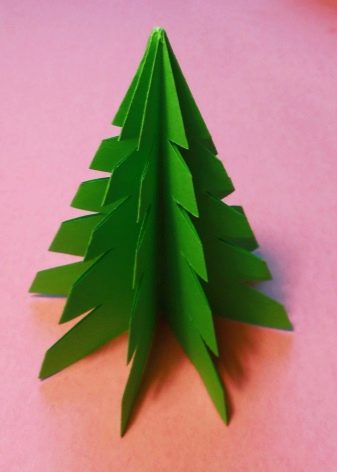 On green leaves, you need to cut 5 identical Christmas trees. They will form the main standing tree. Now we glue all these details and get a voluminous toy. At the very end of this Christmas tree, glue an asterisk cut out of paper.