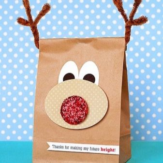 To top it all off, you can decorate the bag with various little things, stickers, carved Christmas trees or snowflakes, putting everything on glue. This will make your gift more individual and memorable for the person to whom you prepared it.