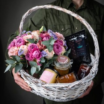 - Gift basket. They can not only contain products, but also cosmetics. They can be filled as you wish. It’s better not just to present such gift baskets in a basket, as it is, but to design them in the New Year’s style: make tinsel, place a toy in the form of a symbol of the year on the handle on the side, and put fir branches decorated with Christmas balls inside.